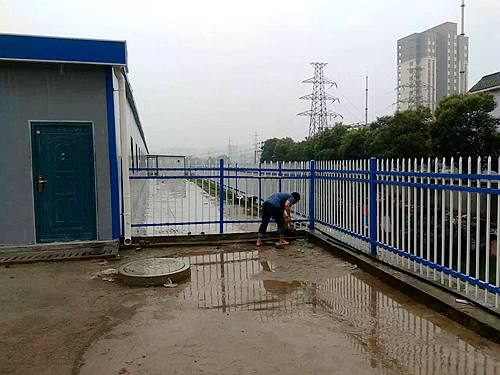 工人冒雨安裝藍白色鋅鋼護欄,只用1天就全部完成