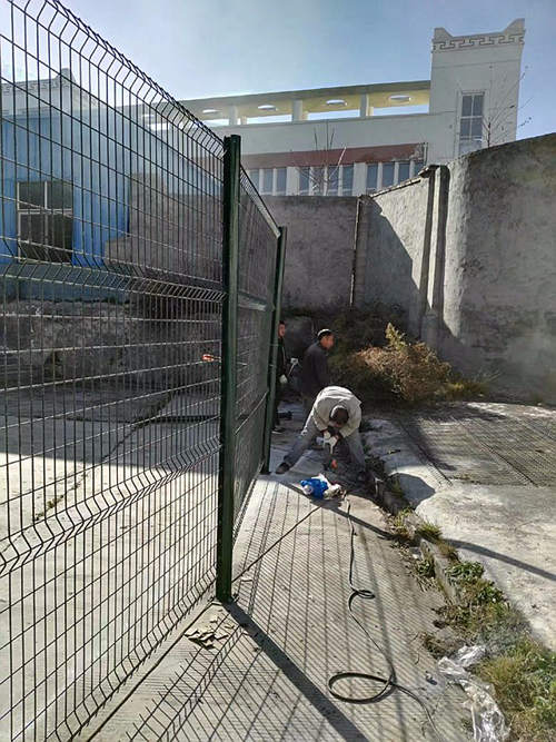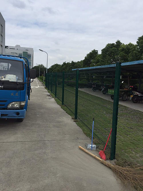 下圖是蘇州工業園區一家化工企業為區域分隔采購的蘇州桃形柱護欄網安裝時拍攝的照片?蛻暨x擇的是桃形柱護欄網,立柱用的100*70mm桃形柱,鋼絲直徑為浸塑后5.0mm,網孔間距為50*200mm,這批南京護欄網的立柱和網片均是墨綠色。