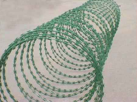 刀片刺繩也稱為刀片刺絲、刀片刺網,是一種新型防護網。刀片刺網由熱鍍鋅鋼板或不銹鋼薄板沖壓出尖銳的刀片狀,高張力鍍鋅鋼絲或者不銹鋼絲做芯線組合而成的阻絕器材。由于刺網造形獨特不易觸摸,因而能達到極好的防護隔離效果.刀片刺繩按照安裝方法不同可分為:(蛇腹式) 螺旋式刀片刺繩,直線型刀片刺繩,平板式刀片刺繩,刀片刺繩焊接網等。刀片刺繩大略分為螺旋型、直線型、螺旋交叉型三種形式。